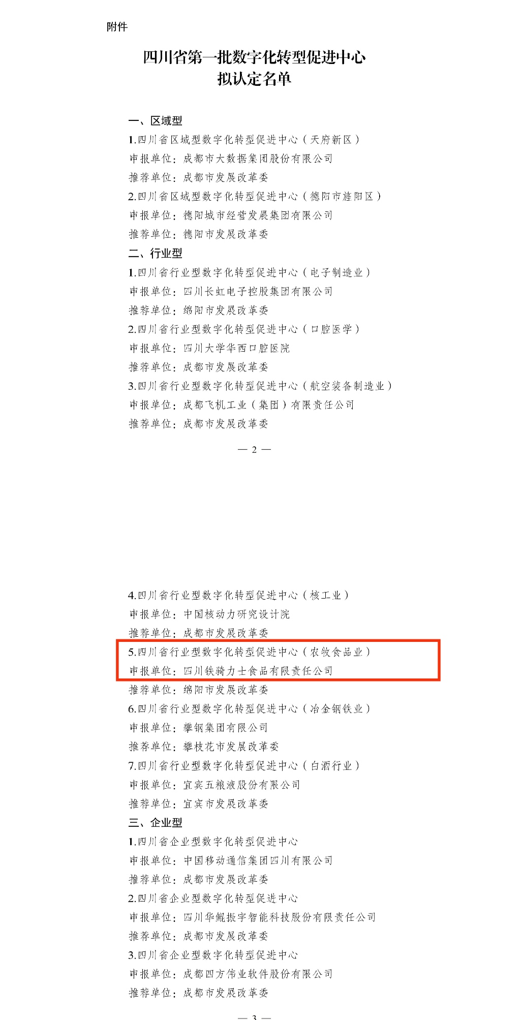 铁骑力士集团作为省内唯一认定的农牧食品行业型企业,与四川大学华西口腔医院、成都飞机工业(集团)、攀钢集团、五粮液集团、中国核动力研究设计院、四川长虹电子控股集团等7家企业共同入选为首批行业型数字化转型促进中心。