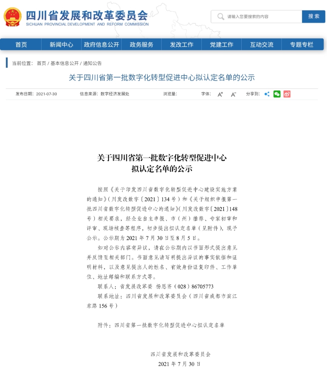 近日,为纵深推进国家“上云用数赋智”行动,在企业自主申报、市(州)推荐的基础上,四川省发展改革委组织专家严格评审并进行公示,确认四川省第一批数字化转型促进中心共12家,其中区域型2家、行业型7家、企业型3家。